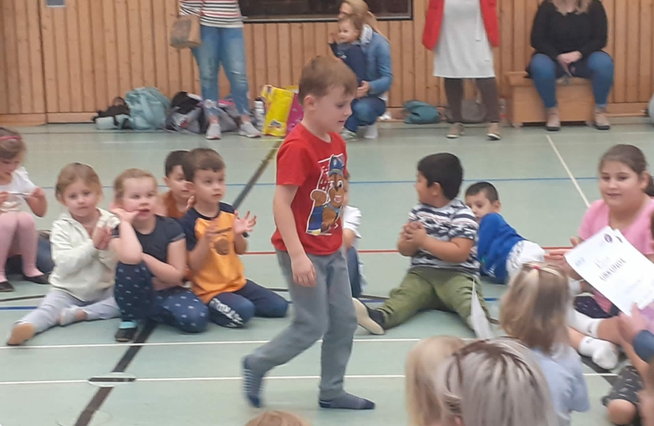 Das Abzeichen wurde von der Sportjugend NRW entwickelt und soll 3- bis 6-jährige Kinder für Bewegung, Spiel und Sport begeistern. Hochmotiviert ging es an die zehn Bewegungsaufgaben, die auf die fünf Hauptbereiche der kindlichen Persönlichkeitsentwicklung abgestimmt sind. Es wurde balanciert, gepustet, in die Tiefe gesprungen, Flüsse überquert, Reihenfolgen aus Alltagsmaterialien gelegt und fortgeführt. Einige Kinder trauten sich vor der kompletten Gruppe Bewegungsaufgaben zu formulieren. Unter großem Applaus der Eltern bekamen die Kinder am Ende ihre Urkunden und kleine Geschenke überreicht.