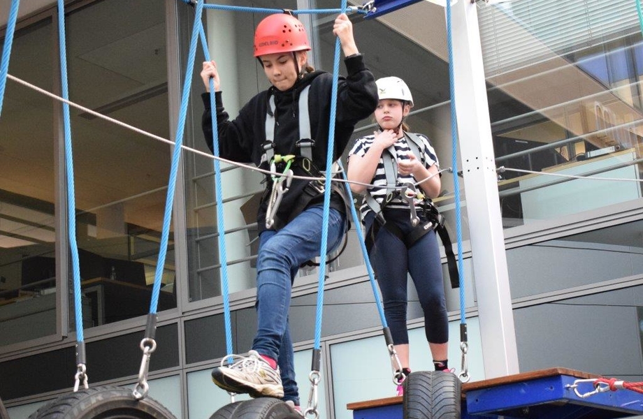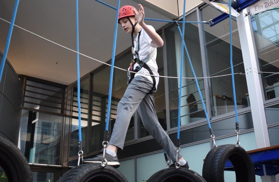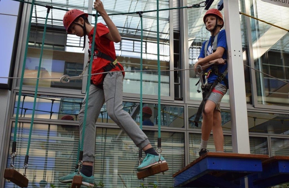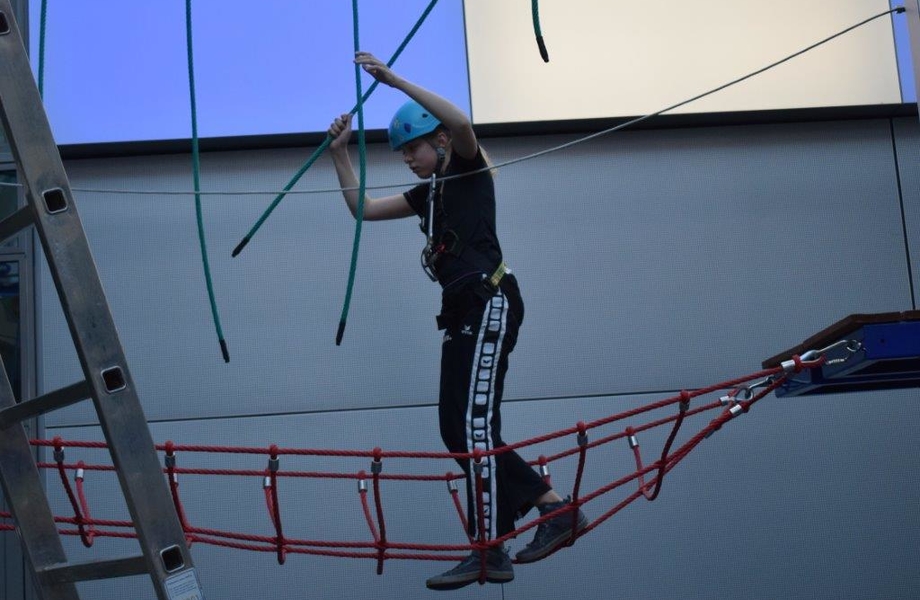 Der SSB verfügt über einen mobilen Hochseilgarten, der diesmal im Atrium des Stadtwerke-Haus am Bochumer Ostring aufgebaut wurde. Und der Nachwuchs des TB Höntrop nahm die kostenlose Einladung der Qrganisatoren gerne an und traf sich mit 12 Jungen und Mädchen zum klettern und springen. Neben dem Kletter-Rundkurs verfügt die Anlage über zwei Bungee-Trampoline, die ebenfalls mit Begeisterung genutzt wurden.