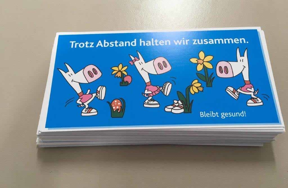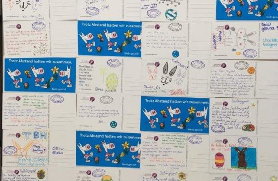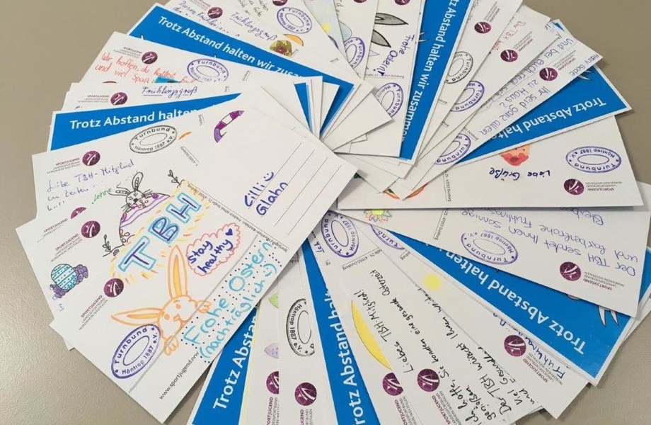 Da der gesamte Sportbetrieb ruht rief das Team den Sportnachwuchs auf, um den Senioren des Vereins einen Gruß zukommen zu lassen. Auf Karten des Landessportbundes NRW konnte jeder einen kurzen Gruß schreiben oder ein kleines Bild malen. So kamen innerhalb weniger Tage insgesamt 74 Karten zusammen. Anschließend wurden die Karten beginnend beim ältesten Vereinsmitglied - bei der 95jähren Irmtraud Bach aus der Grupppe Gymnastik im Sitzen - von der Freiwilligendienstleistende Elena verteilt.