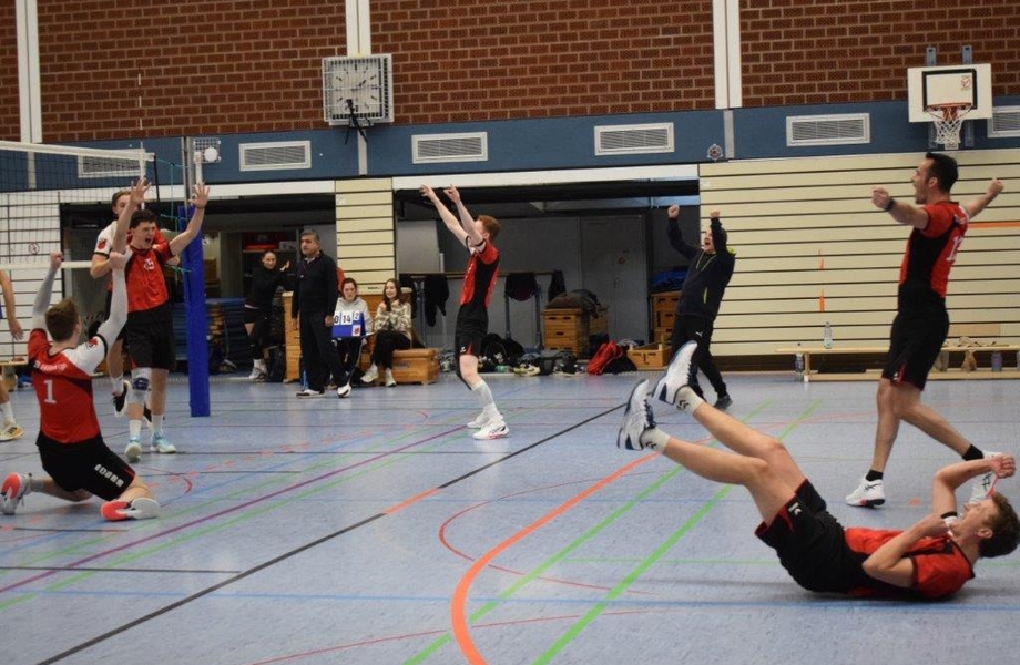 Aber der Start geriet dort mit 0:4, 2:6 und 3:7 völlig daneben. Erst Diagonalspieler Aaron schaffte es mit gutem Service beim 7:7 den Ausgleich herzustellen. Nach dem Seitenwechsel (7:8) konnte das Team mit Jo am Aufschlag fünf weitere Servicewinner holen. Der TSC war in dieser Phase völlig von der Rolle und machte es dem TBH mit zahlreichen einfachen Fehler aber auch sehr leicht. Den letzten Punkt machte dann Florian, als er einen wuchtigen Angriff senkrecht nach unten blockte und der TBH den Satz mit 15:10 und damit das Spiel noch 3:2 gewinnen konnte. Entsprechend groß war die Freude im Team.