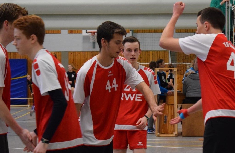 Richtig spannend wurde es dann im dritten Satz, als die Mannschaft nach einigen Veränderungen zunächst deutlich zurück lag. Erst die Einwechselung von Stammspielmacher Fynn beim 13:18 sorgte wieder für etwas mehr Stabilität im Aufbau. Entscheidend war aber der Wechsel von Umberto auf der Außenposition, der für den in dieser Phase glücklosen Jan hereinkam (15:21). Zunächst musste der TBH beim 17:24 aber einen Satzball abwehren, was auch mit Bravur gelang. Anschließend servierte unser Austauschschüler aus Parma erstklassige Aufschläge, die zusammen mit einem enorem starken Block dafür sorgten, dass Höntrop wieder herankam. Und nicht nur das, denn am Ende gewann die Mannschaft diesen Satz noch mit 26:24.