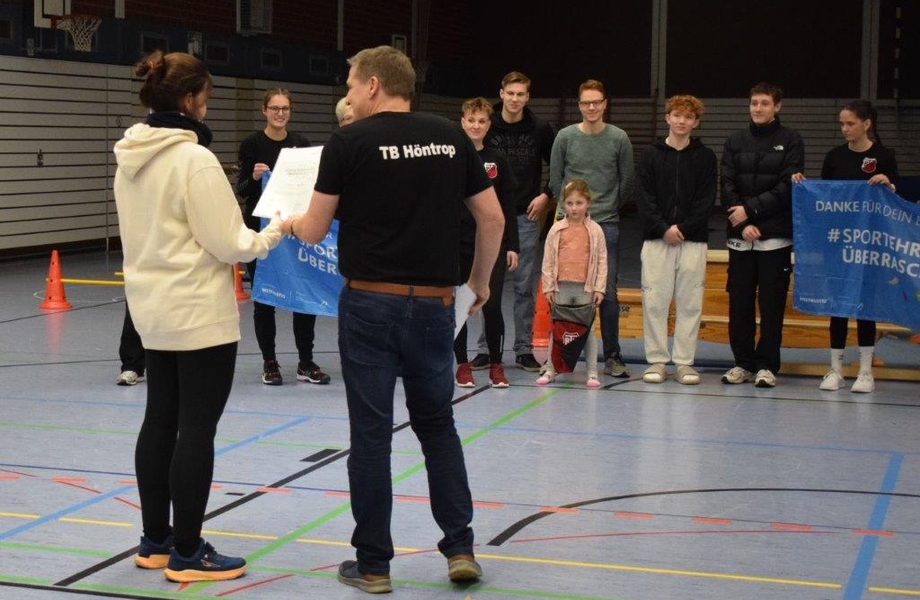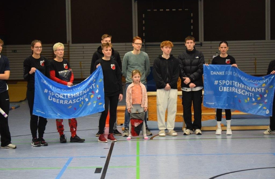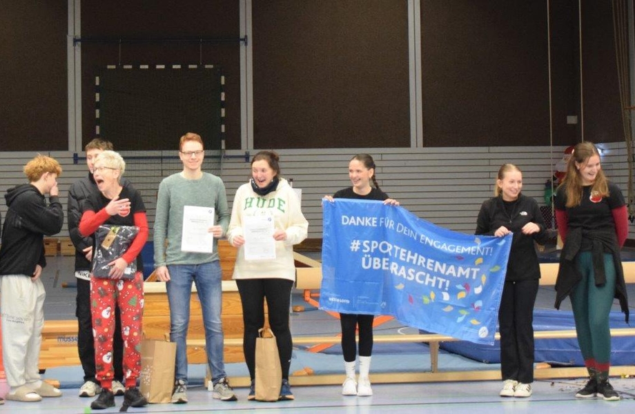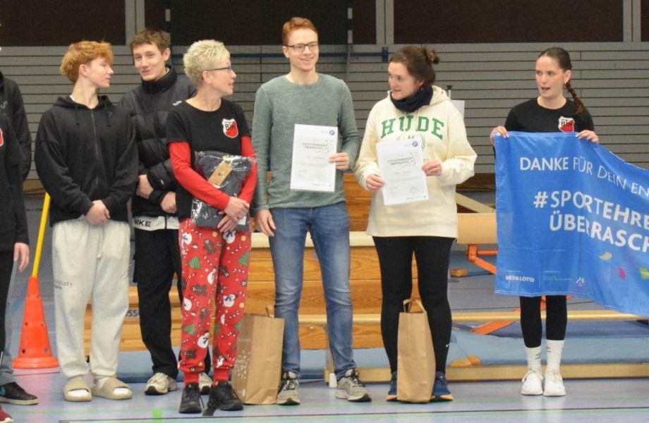 Bevor die beiden Pakete am 08. Dezember im Rahmen der Weihnachtsfeier der Kindergruppen überreicht wurden, erhielt Sabine Lenders für ihren unermüdlichen Einsatz im Kinderbereich einen Ehrenamtspulli, den der Verein vom LSB zusätzlich erhalten. Bei den Übergaben gingen allerdings anschließend die Raketen im wahrsten Sinne des Wortes nach hinten los.