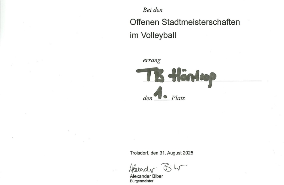 Dort zeigte das Team dann, dass es Stehvermögen hat. Nach dem recht klaren 25:19 zum Auftakt bekam der Gegner PTSV Aachen III (VL) im Laufe des nächsten Satzes lautstarke Unterstützung von seiner anderen Mannschaft. Der bereits erspielte Vorsprung schmolz dahin und es entwicklelte sich ein packendes Finish. Nach einigen Matchbällen für den TBH aber auch ein paar Satzbällen für den PTSV ging der Satz schließlich mit 36:34 an die Höntroper, die sich ob des nicht eingeplanten Erfolges sehr freuten.