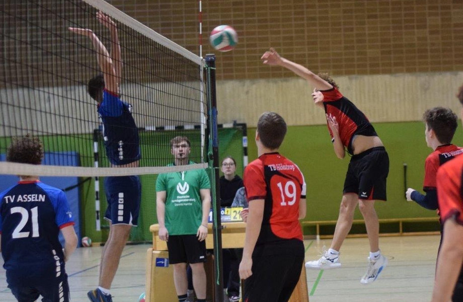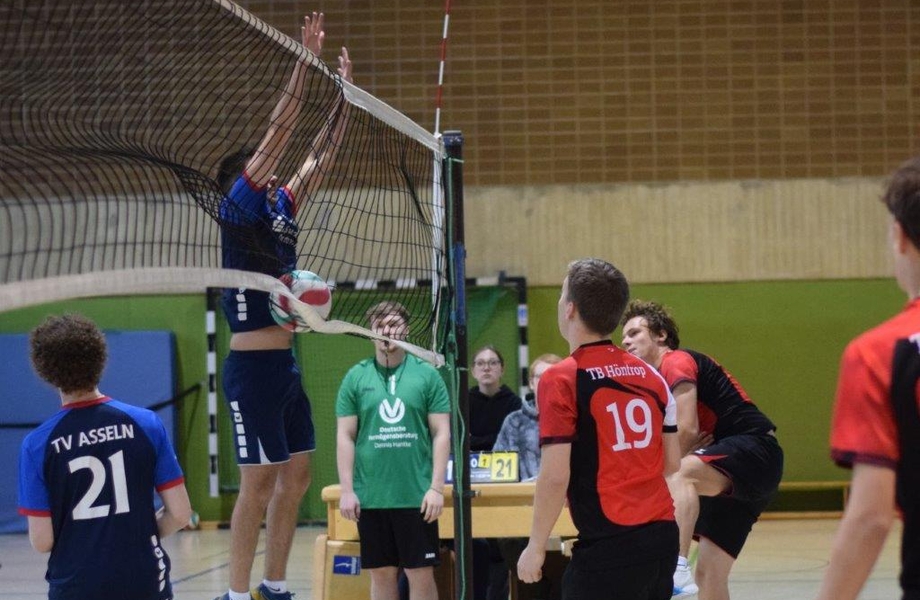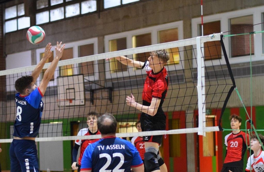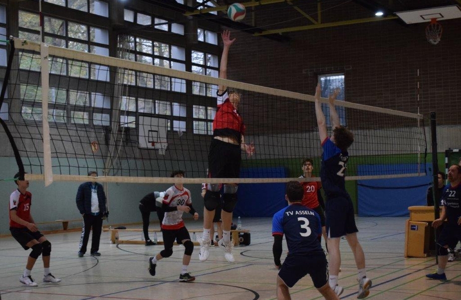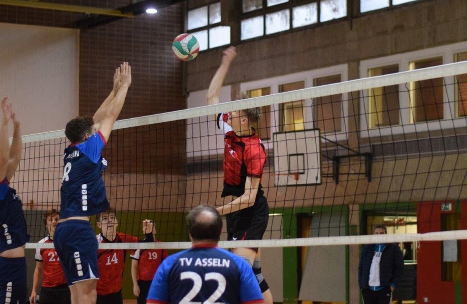 Die Mannschaft überzeugte dann im Spiel von Anfang an mit einem sehr konzentrierten Spiel und zeigte in praktisch allen Elementen, dass sie zu Recht Vize der Liga sind. Über 14:7 und 21:15 schien sich ein leichter erster Satzgewinn anzubahnen. Allerdings verlor das Team dann zum Ende hin ein wenig die Spannung und machte nun reihenweise einfache Fehler. Asseln kam in zwei Rotationen zu sieben Punkte und plötzlich war der Vorsprung beim 22:22 verspielt. Aber als Paul danach an den Aufschlag kam, setzte er unerschrocken zwei Top-Spin Bälle vor die Füße des Liberos und der Satz ging verdientermaßen mit 25:22 an den Turnbund.